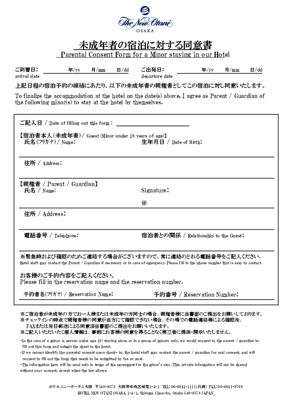 また、未成年の方おひとりまたは未成年の方同士にてご宿泊される場合、下記より同意書を印刷いただき、必要事項をご記入・ご捺印の上、チェックインの際にご持参ください。