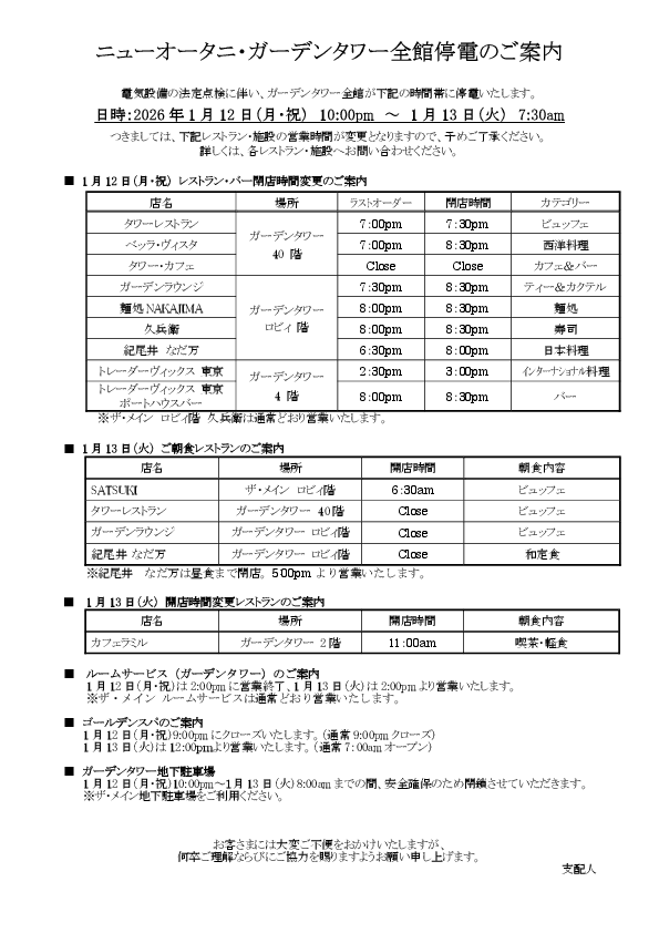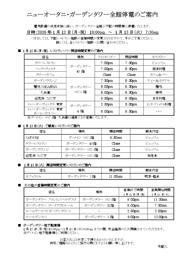 ニューオータニ・ガーデンタワー全館停電のご案内