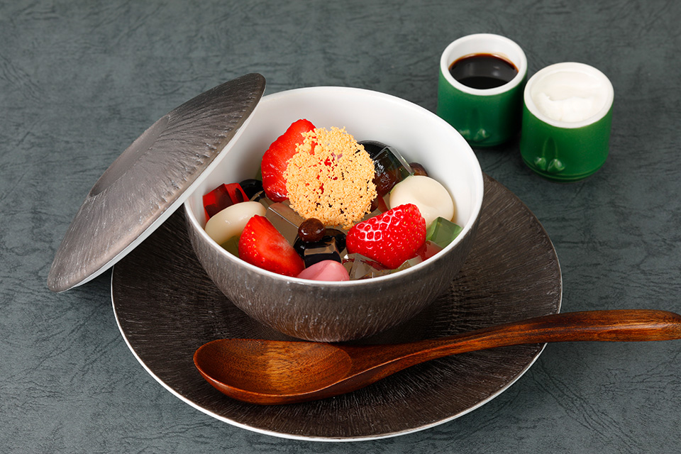 あまおうと相性の良い「チーズ」を組み合わせた和洋折衷なあんみつを考案しました。甘みが強く酸味のバランスも良いあまおういちごとクリームチーズをそれぞれ練り込んだ二色の白玉、ホテル自慢の豆かん、そして大粒のあまおうを盛り付けた豪華な逸品。味変には塩気がクセになるカリカリのチーズダンデルを飾り付け、更に自家製ミルクと黒蜜を添えました。これぞ甘味と酸味のカーニバル!おいちーご♪&おいちーず♪な新感覚あんみつ!