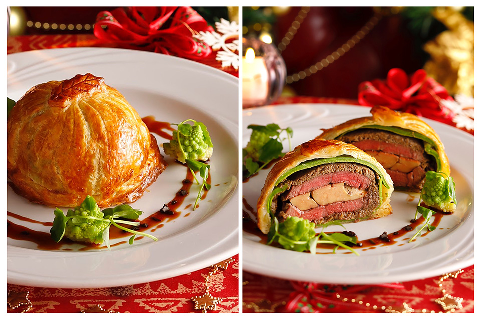 世界中の美食にインスピレーションを受け、絶えず進化を重ねてきたトレーダーヴィックスの料理。聖夜を彩る特別なコースのメインディッシュは、美しい断面の「クリスマスウェリントン」。自慢の薪窯で焼き上げた牛フィレ肉でフォアグラを挟みパイで包んだ、特別な夜にぴったりな一皿です。そのほか、帆立のグリルやロブスタービスク、蒸し鮑といった厳選食材、デザートにはあまおう苺をたっぷりと使用したタルトをご用意。リゾートムードあふれる店内で、非日常なひとときをお過ごしください。