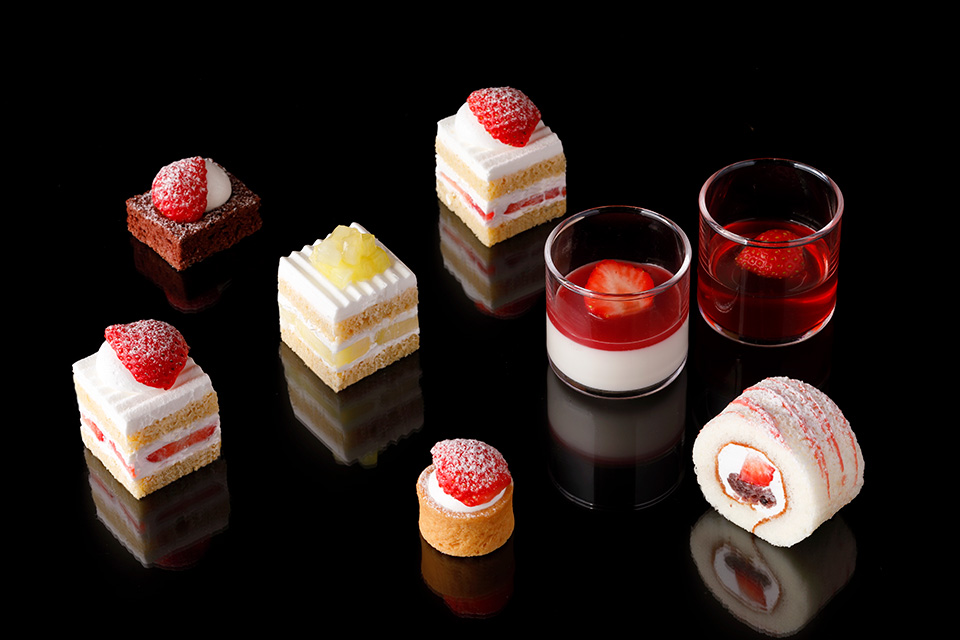 ホテルニューオータニが誇るスイーツ、“スーパーシリーズ”の『新スーパーあまおうショートケーキ』は、シンプルながらも、博多あまおうの魅力を存分に味わえるよう、カステラにも使われる長崎県産「太陽卵」を使用したスポンジ生地、九州大牟田産の生クリームを採用した極上のショートケーキはビュッフェサイズでご用意。さらに、シルキーなスポンジ生地が特徴で多くのファンを魅了するいちごスイーツの重鎮『ストロベリーショートケーキ』も登場。スイーツ好きにはたまらない、“ショートケーキの食べ比べ”も実現します。そのほか、ふんわりとしたロール生地であまおう・生クリーム・ 黒蜜あんこを包んだ『あまおうロール』、サクサクの生地がたまらない『あまおうタルト』、あまおうの果汁がたっぷりと入った『あまおうゼリー』など、旬を迎えるあまおうスイーツが勢揃い。