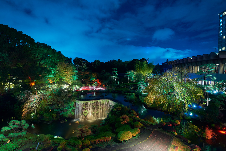 加藤清正公の下屋敷や井伊家の庭園として400年余りの歴史を有し、江戸城外堀に囲まれた広大な日本庭園は、東京名園の1つ。冬景色を全面ガラス張りの「フルハイトウインドウ」から臨むきらきらと輝くライトアップが広がる日本庭園を目の前にお食事をお愉しみいただけます。