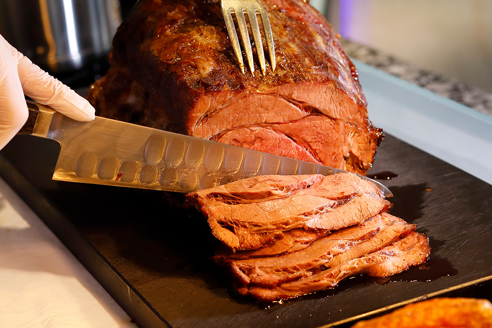 スイーツナイトビュッフェ限定で、ホテル自慢の『ローストビーフ』が登場。ほんのりと赤みが残る程度に熱の通りを調整し、肉汁が染み出すようにじっくりと柔らかく焼き上げる製法は、代々受け継がれてきた手法。ジューシーで香り高く、噛むほどに口の中に広がる赤身本来の旨みが際立つ逸品です。そのほか、オマール海老などのシーフードの豊かな風味を愉しめる、スパイシーなベシャメルソースの『スパイシーシーフードドリア』、フランスジュラ地方の特産「黄ワイン」を使用した芳醇なソースで仕上げたチキンのクリーム煮『フリカッセチキン』など、バラエティに富んだメニューをスイーツとともにお愉しみいただけます。