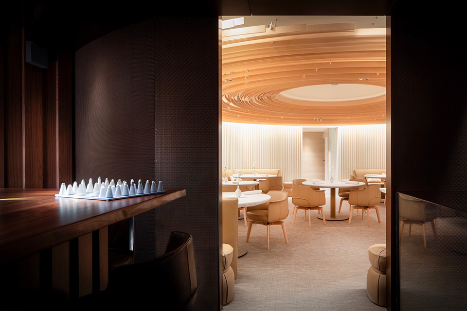また、約30年にわたりミシュラン二つ星を守り続けたアンリ・フォージュロン氏の名店跡地に店を構えており、内装は世界的建築家・隈研吾氏率いる隈研吾建築都市設計事務所が手掛けており、まるで現代美術の舞台を思わせる独創的な空間です。