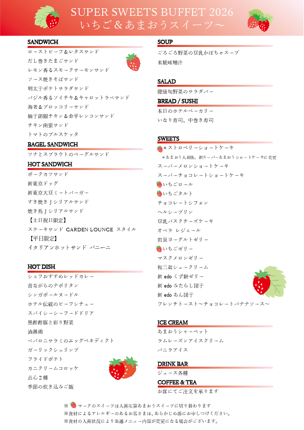 旬のいちごを使用したスイーツビュッフェを、絶景のガーデンビューとともにお愉しみください。