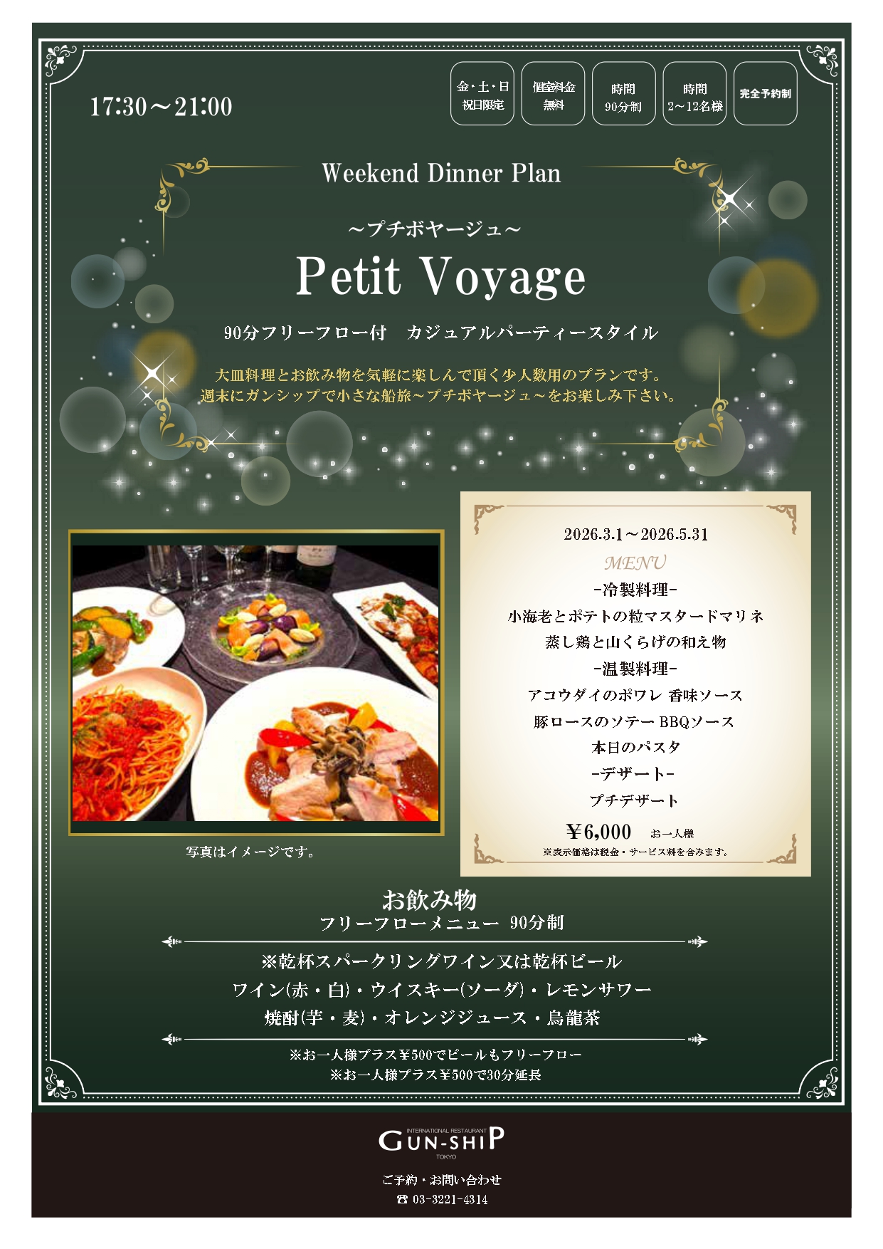 期間 : 2026年3月1日(日)~2026年5月31日(日)曜日時間: 金・土・日・祝日 17:30~21:00人数 : 2名~12名