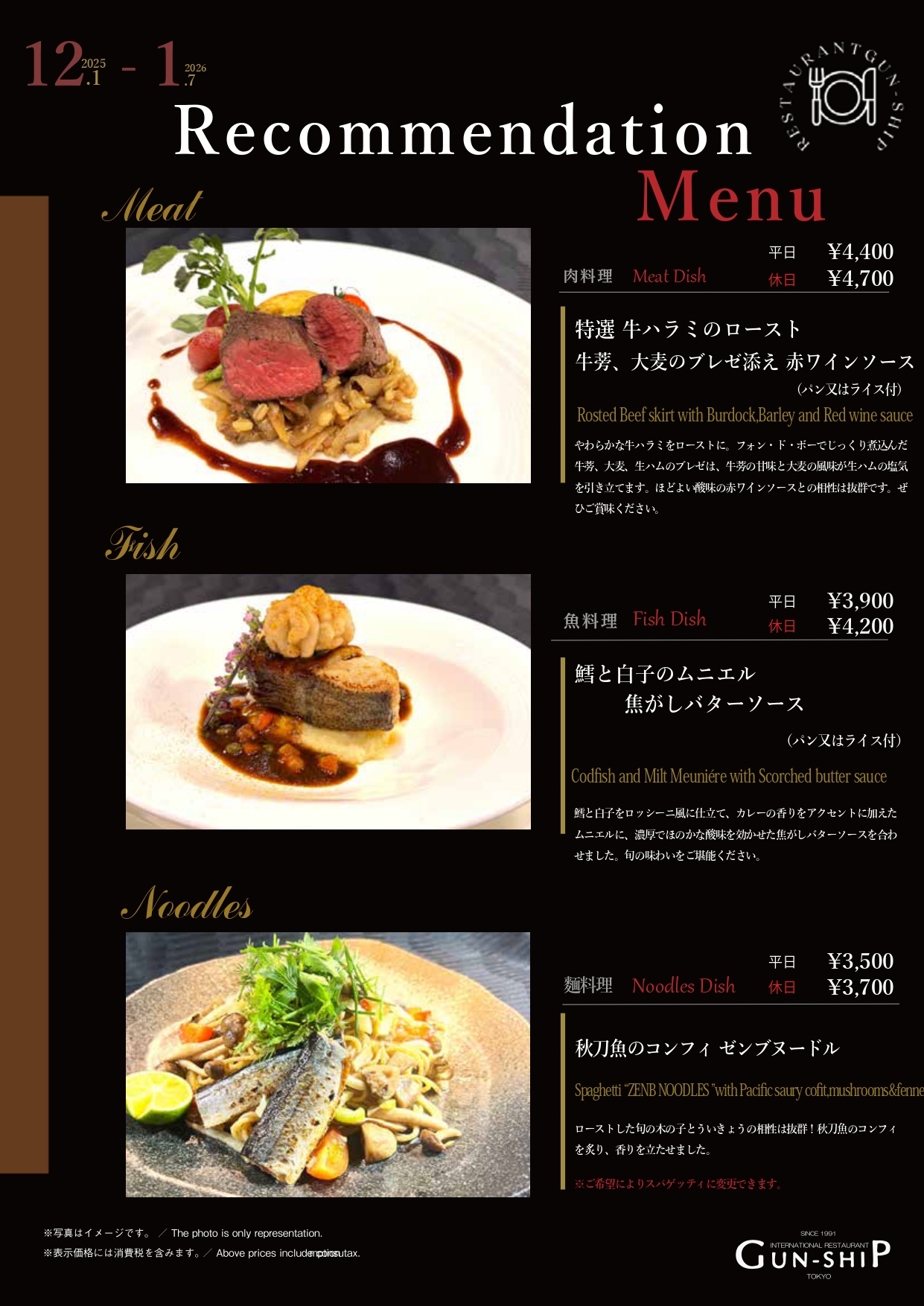 旬の食材を使ったシェフおすすめのお肉料理、お魚料理、麺料理をご用意して