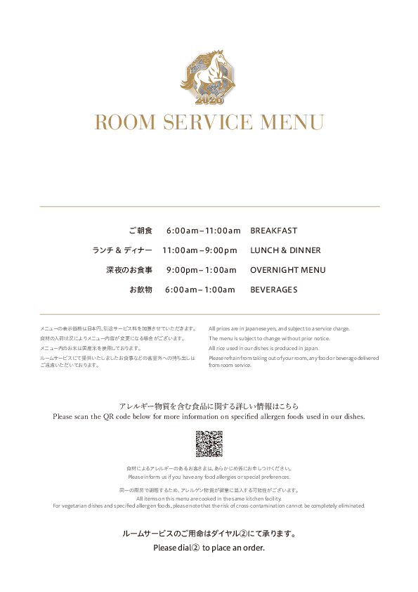 ※メニュー内容が変更・休止、及びご提供時間が変更となる場合がございます。最新情報につきましてはルームサービスまで直接お問い合わせください。