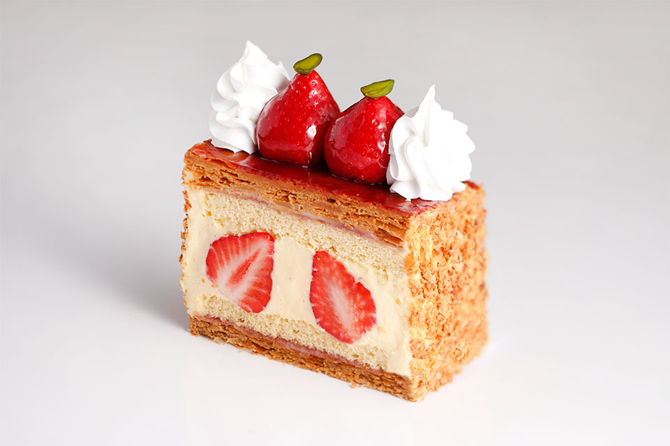 サクサクのパイ生地と特製カスタードクリームで博多あまおうをサンドしたナポレオンパイ。