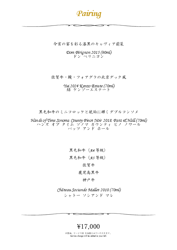 1名さま ¥28,000~ワインペアリング付 1名さま ¥45,000~