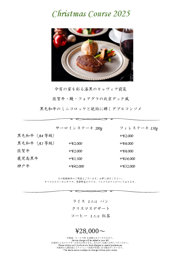 老舗ステーキハウスで贅沢なクリスマスをお過ごしいただける、特別メニューをご用意いたしました。この期間でしか愉しめない、フルコースを是非ご堪能ください。