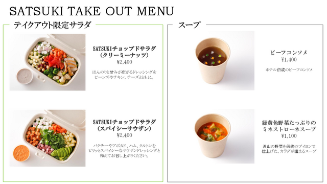 SATSUKIの人気洋食メニューや新東京バーガーなど、ホテルシェフこだわりの食材を使用したメニューの数々をご自宅でもお愉しみください。