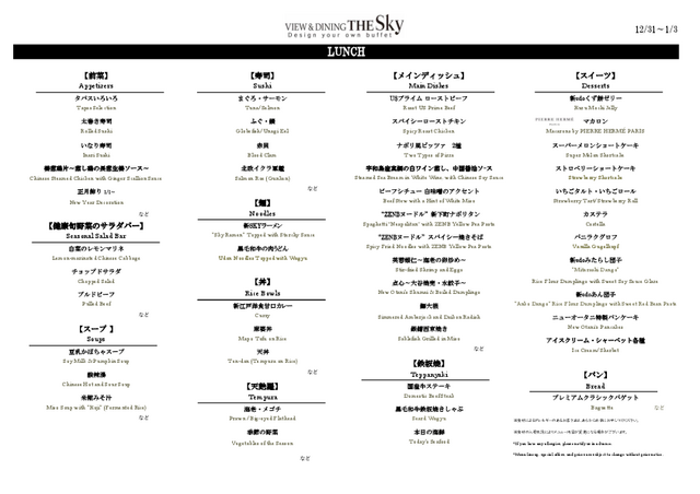 年末年始を華やかに彩る特別メニューと360度の展望とともに、ステージキッチンよりご提供する、和・洋・中の出来立ての絶品料理をお楽しみいただけます。