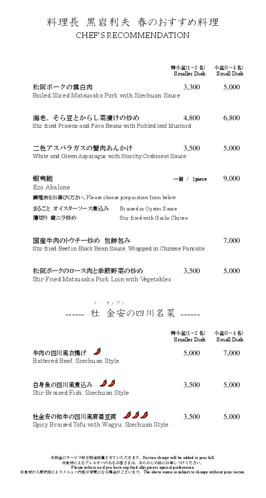1964年の開店以来、多くの美食家に愛されてきた本格上海料理「大観苑(たいかんえん)」。黒を基調に洗練を極めた店内は、全面フルハイトウインドウの窓から、眼下に広がる1万坪の日本庭園から遠く東京タワーまでが一望に。 “王道主義”を貫くメニューは、さらにグレードアップ。特にふかひれの姿煮は、天日干しの希少で上質なものを用いるほか、伊勢海老や鮑などの特撰素材メニューから、8種類の紹興酒や、ソムリエが厳撰するワインなども充実。 料理長 黒岩利夫や、中国から招聘した料理人が本物の味をお届けします。