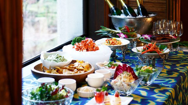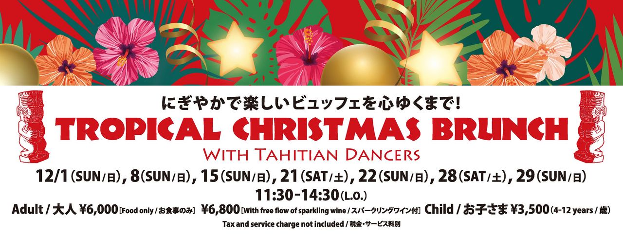 休日のブランチは、リゾート気分でゆったりと。トレーダーヴィックス自慢の“魔法の薪窯”で香ばしく燻し焼き上げたローストビーフや、世界中の美味しさを集めた数々のお料理をビュッフェスタイルで。毎月登場するシーズナルメニューもおすすめです。フリースパークリングワイン付のプランもお選びいただけます。