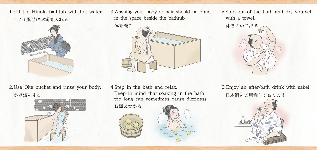 全室に設置された香り豊かなヒノキのお風呂をはじめ、江戸の文様をほどこしたインテリア、さらに日本酒のサービスなど「江戸」を五感で感じていただく一方で、タブレットなど最新のテクノロジーを生かした現代の快適性も追求しました。