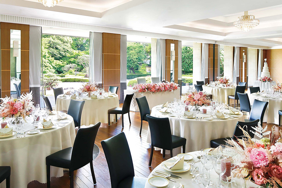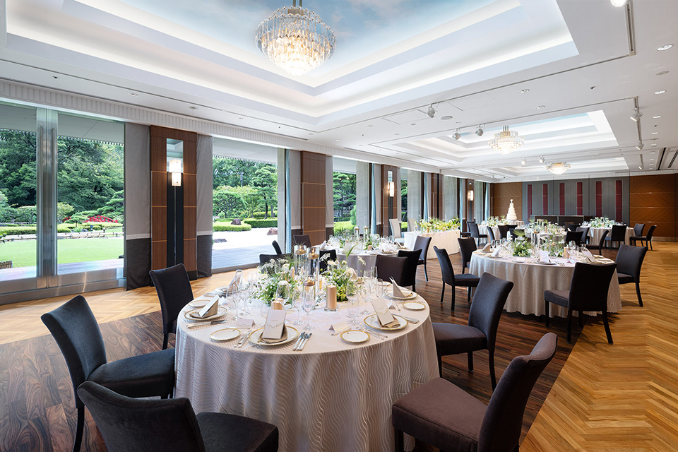 イタリアの邸宅をコンセプトに、フローリングやオープンキッチンを採用したモダンなバンケットルーム。 バーカウンターを設けた専用ラウンジでゲストをお迎えし、テーブルからは日本庭園が間近にご覧いただけます。