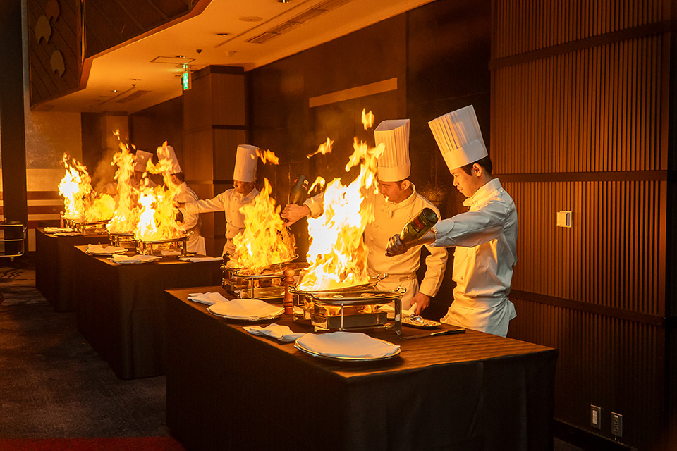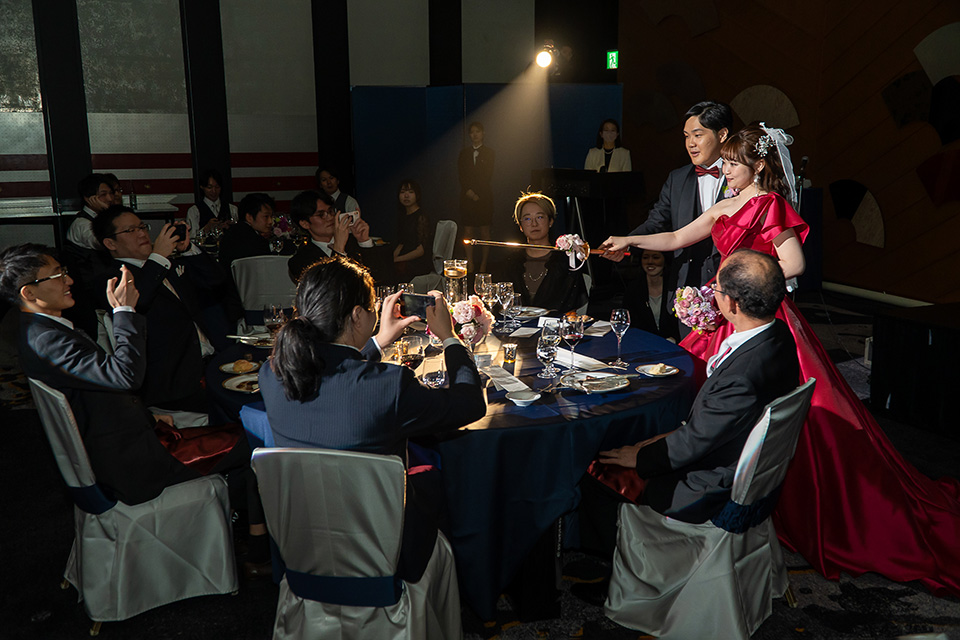 披露宴には、100名近くのゲストにお越しいただき、ブライダルフェアで想像した景色がそのまま目の前に広がっていました。ゲストの皆さまからは、お料理がとても美味しかったと大好評で、キャンドルサービスやお肉のフランベなどの演出も楽しんでいただけたようです。